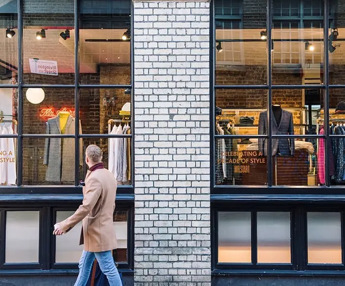 Person walking past colorful street art murals in Shoreditch London near art exhibition