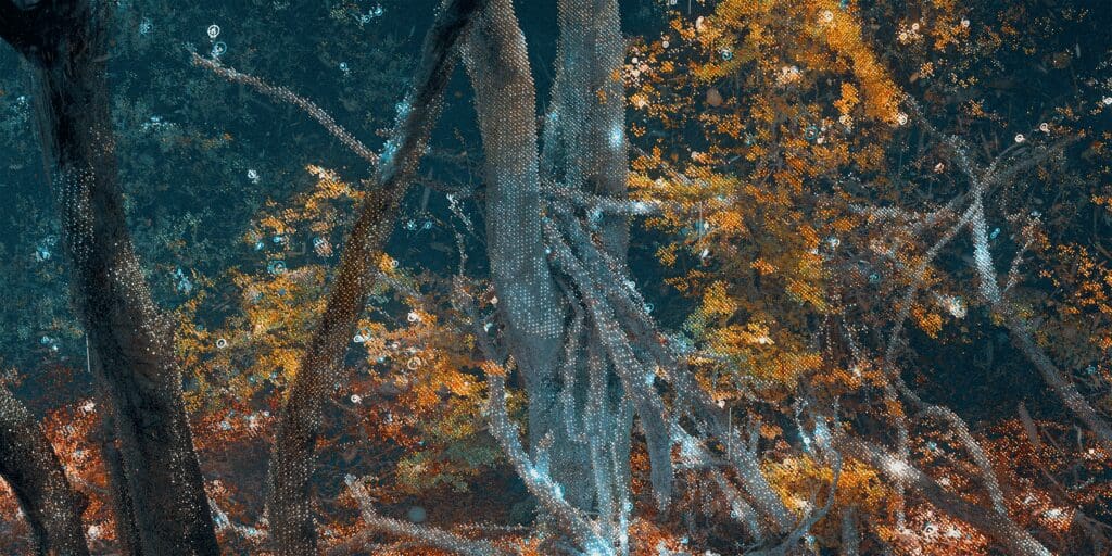 A Conversation Between Trees invites viewers into an immersive exploration of the subtle exchanges that occur within forest ecosystems. Drawing on 3D scan data captured in Epping Forest, the work translates the hidden communication networks of trees and plant life into a dynamic world of light and sound.