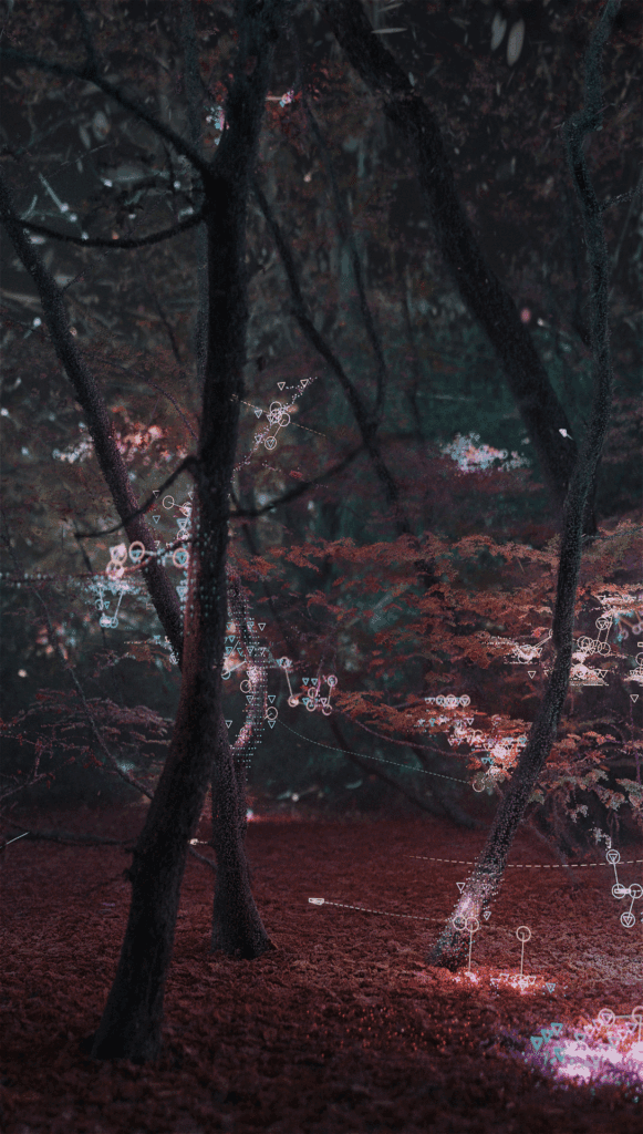Abstract forms, generated from the scan information, shift and evolve in response to time, temperature, light, and environmental change. The same data points also drive a series of synthesisers and sound engines, allowing the forest itself to shape the auditory landscape.