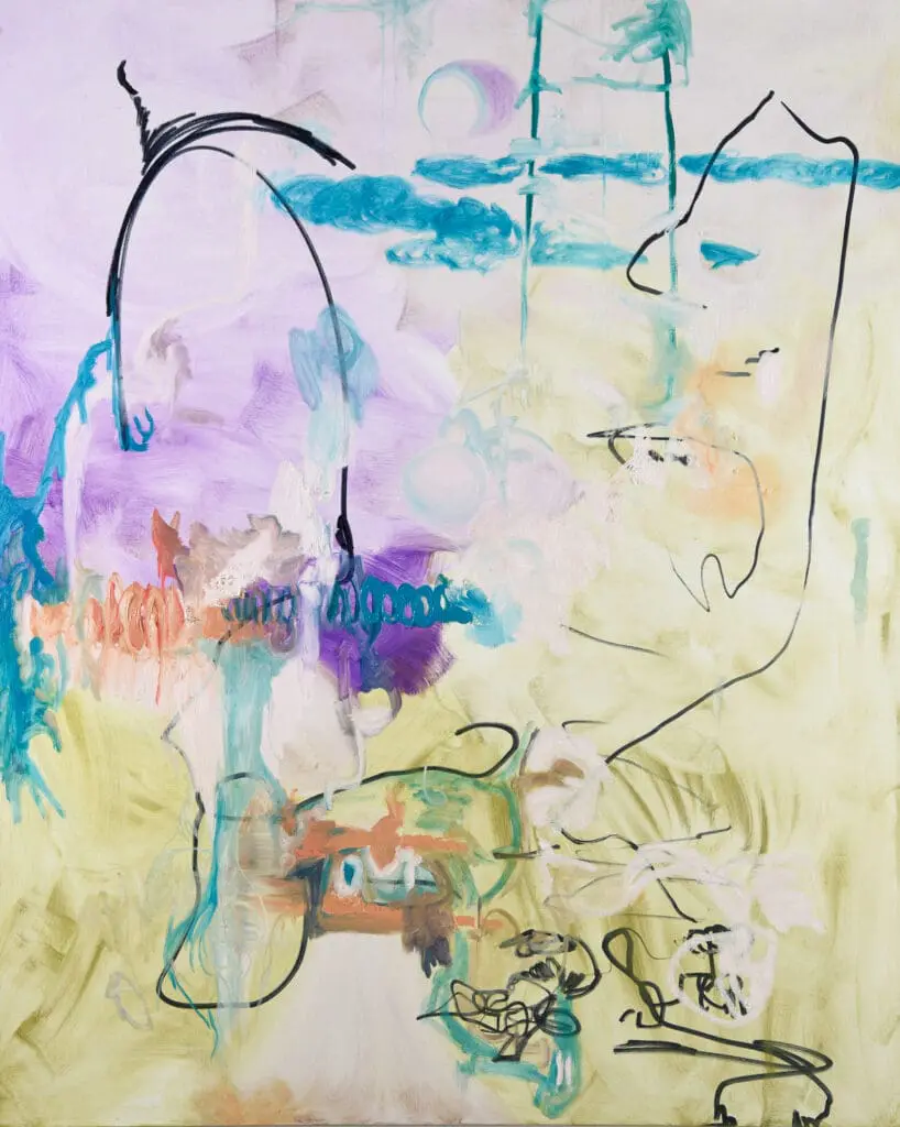 Observing and honouring these inner states, letting them set the rules of the game that each painting evolves into, is a devotional and energetic practice of aligning herself with her own source of direct knowing.