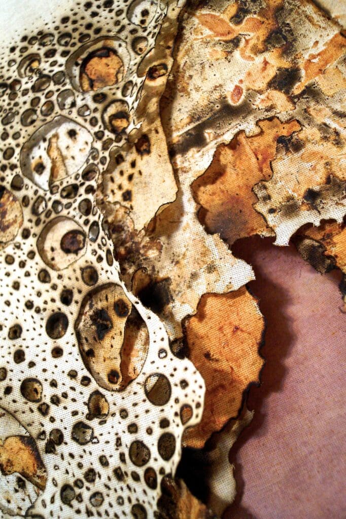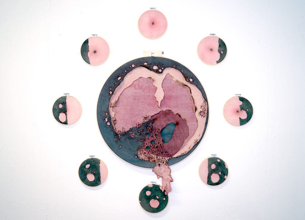 During the residency, Ekaterina will explore the embroidery hoop as a space for redefinition, engaging with an object historically linked to domestic labour and the feminine sphere. Working with second-hand clothing, fabrics, and pigments, she replaces conventional stitching with gestures of burning, piercing, and cutting. These interventions reveal traces of wear and time, extending the language of embroidery beyond its decorative function. The hoop becomes a microcosm — a world suspended within a circle — reflecting cycles of change that unfold across every scale: from the cellular to the cosmic, from the personal to the collective.