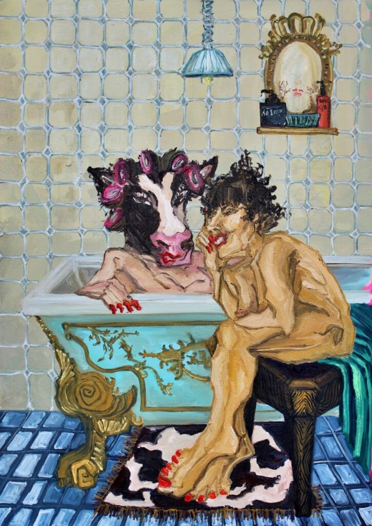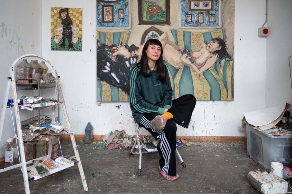 Mia Wilkinson is a UK-based multidisciplinary artist whose practice interrogates Western constructions of the domestic female through painting, drawing, collage and rapidly produced sculptural forms. Rooted in a working-class upbringing in the North East and shaped by a complex matriarchy alongside the absence of her Asian father, her work explores gendered performance, racial fragmentation, social visibility and bodily power. Through thick impasto, fractured pattern, repetition and collision, she constructs psychologically compressed interior spaces where grotesque, bawdy bodies disrupt inherited artistic and cultural hierarchies.