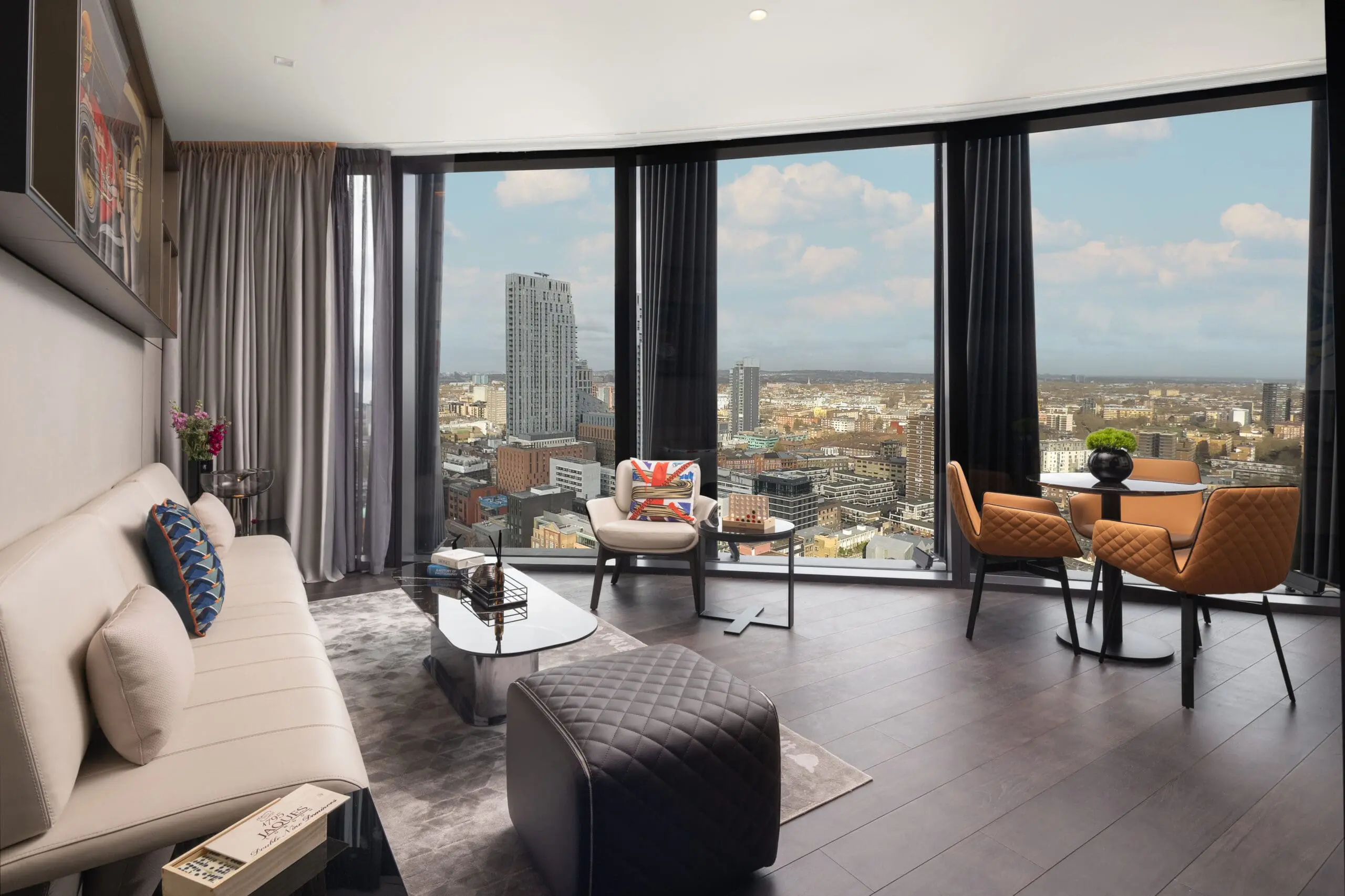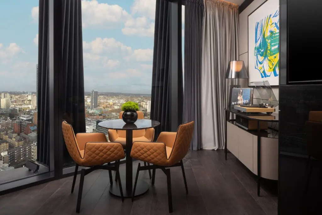 One of our most premium suites on the 23rd floor, bold, spacious and artfully curated. The Junior Masterpiece Suite features a separate bedroom and luxurious lounge, spectacular skyline views, original D*Face artwork, freestanding large bath, vinyl record player, Dyson styling tools, a personal cocktail station and TechnoGym fitness kit – perfect for longer stays or entertaining in style.