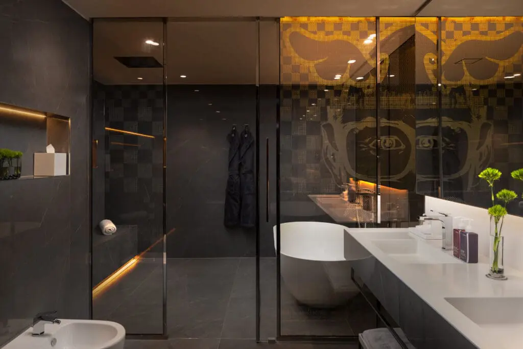 Bold, spacious and artfully curated. The Junior Masterpiece Suite features a separate bedroom and lounge, original D*Face artwork, skyline views, and luxury touches like a freestanding tub, TechnoGym kit, Dyson styling tools and a personal cocktail station—perfect for longer stays or entertaining in style.