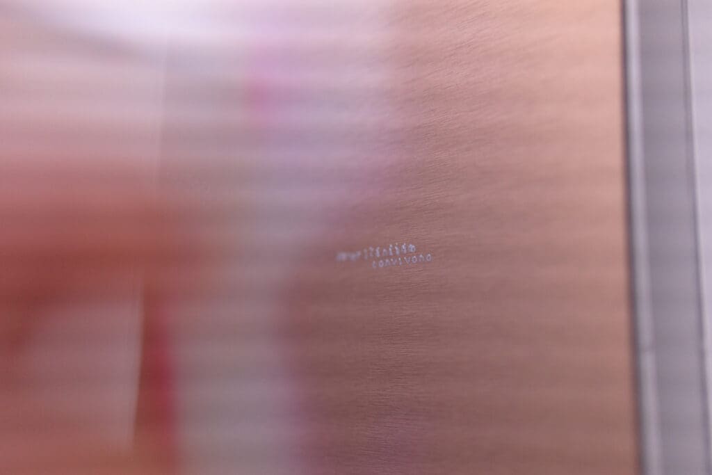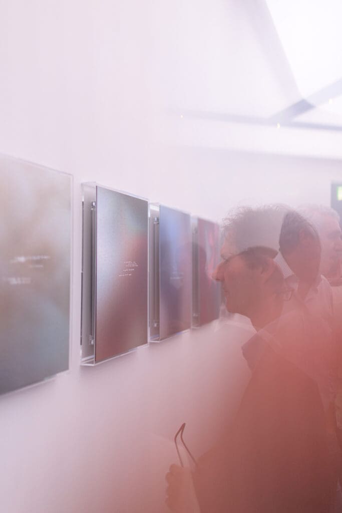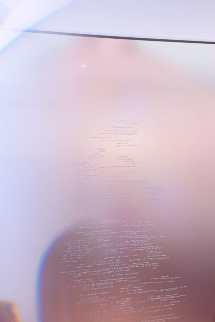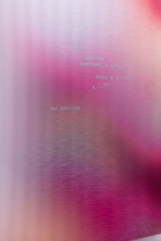 Although presenting individual, autonomous works, Sveva Angeletti’s exhibition is structured as a single immersive and engaging installation, where the boundaries between video and surface, image and text, presence and reflection break down. Angeletti does not offer an exhibition in the traditional sense, but constructs an environment in which the works contaminate and absorb the space.