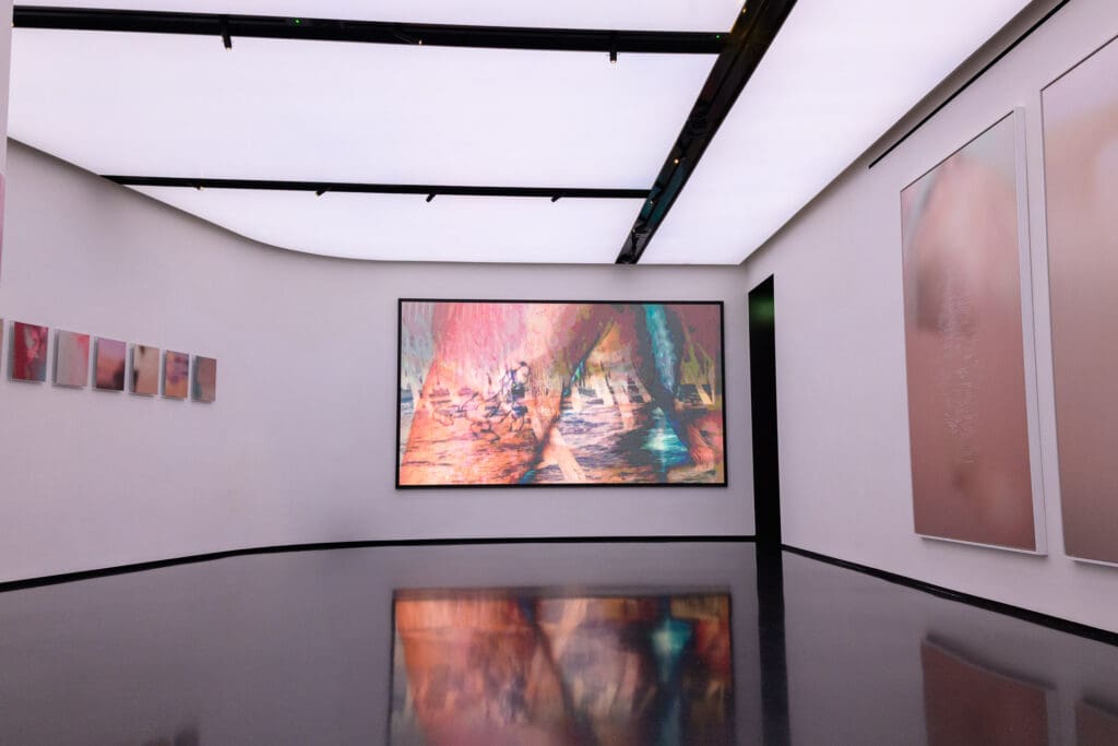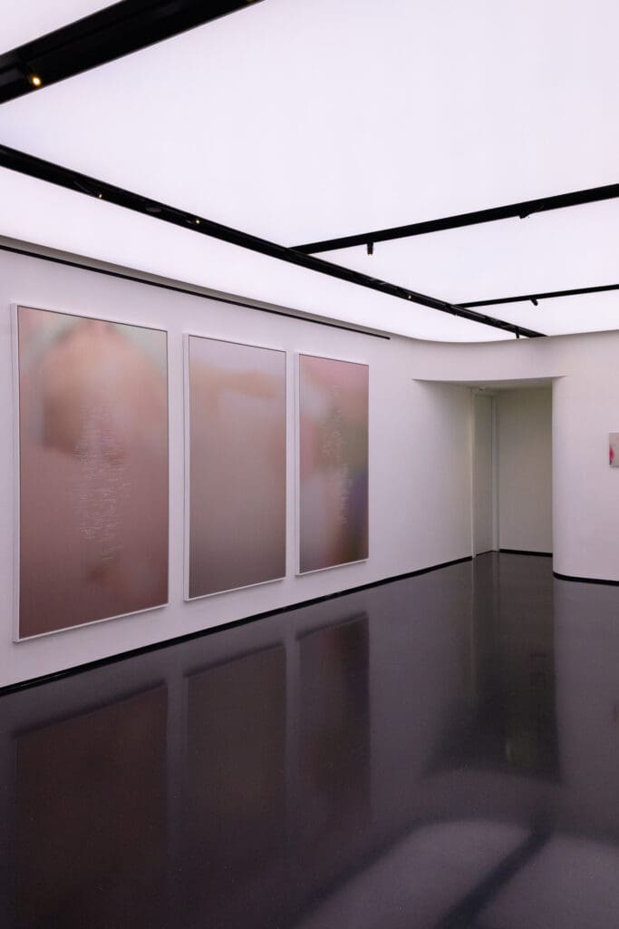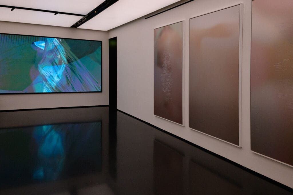 In addition to the works, Da dove veniamo? Chi siamo? Dove andiamo? (Where do we come from? Who are we? Where are we going?) is presented, a diptych video that interacts irregularly with the rest of the exhibition. Two bodies run in opposite directions without ever meeting, while fragmentary and disorienting images flow across the screen, accompanied by a sound that amplifies the tension. The title, which recalls Gauguin, opens like a suspended question, without an answer, evoking an ever-shifting horizon: a curve that continually eludes any attempt to fix its meaning.
