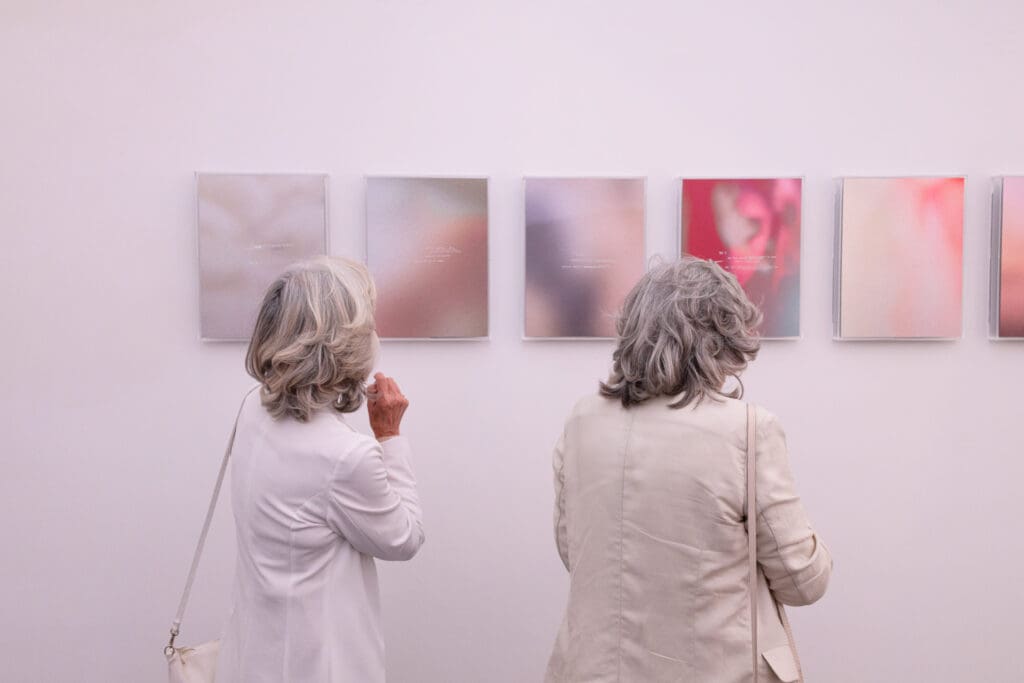 Guests enjoying a sophisticated art event at art gallery art'otel hotel Rome with champagne glasses and modern artistic backdrop.