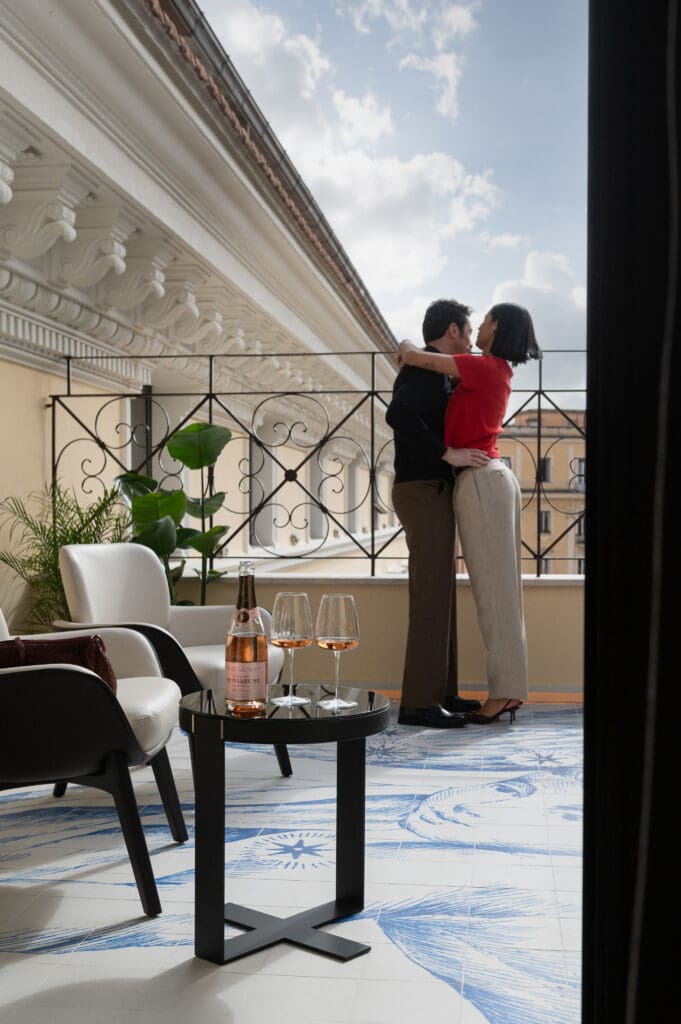 A chilled bottle of premium bubbles awaits you, setting the tone for a memorable beginning to your Roman love story.