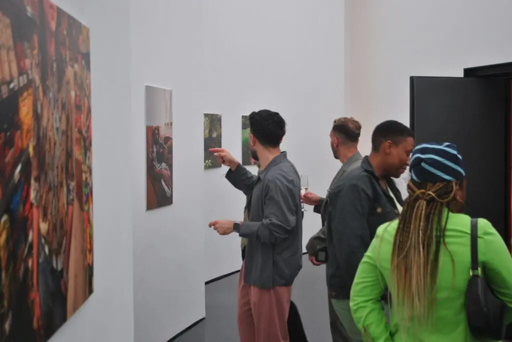 Groups of people talking in a gallery with the exhibition in the background Ted Brown and Jawadat Bashorun smiling in front of Jawadat's portrait from the exhibition People chatting in front of pictures from the exhibition.