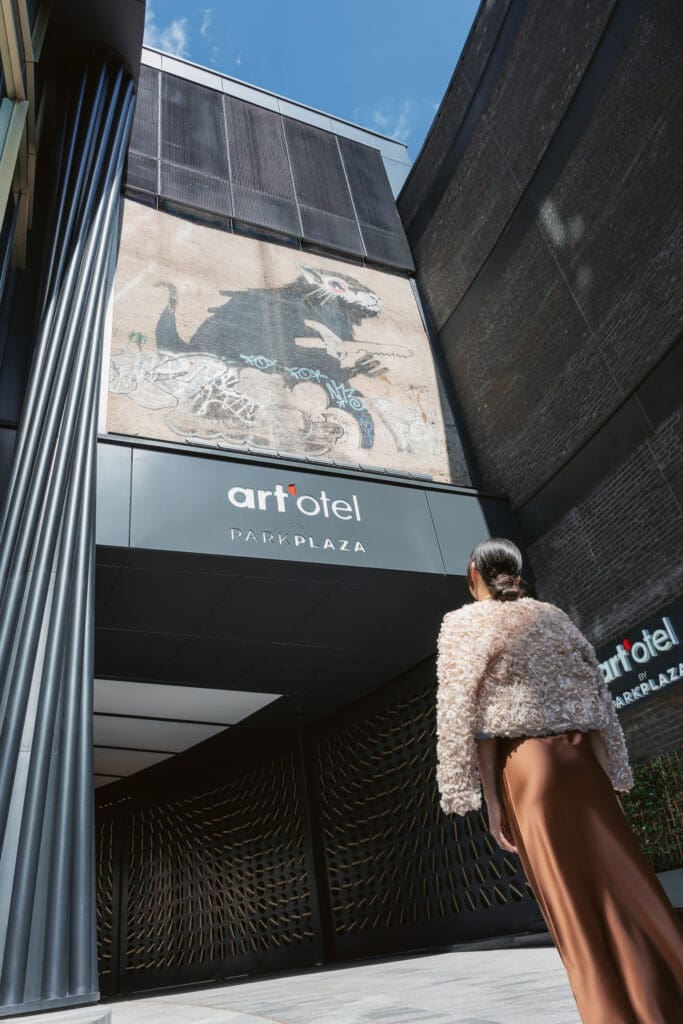 Knife‑and‑Fork Rat & TV Out of the Window, art’otel London Hoxton. Two classic early-2000s Banksy stencils from The Foundry days, once hidden for years, now live above the hotel entrance and are viewable from the street.