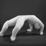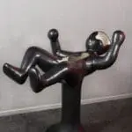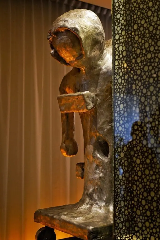 Astronaut is on a roll en gaat overal heen. Maar nogmaals, hij staat op een voetstuk, met zijn go-to-bag paraat en al. Hij zit gevangen in een limbo, wat blijkt uit het gebruikte materiaal dat er tegelijkertijd futuristisch en gefossiliseerd uitziet.