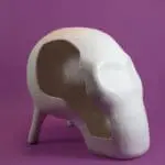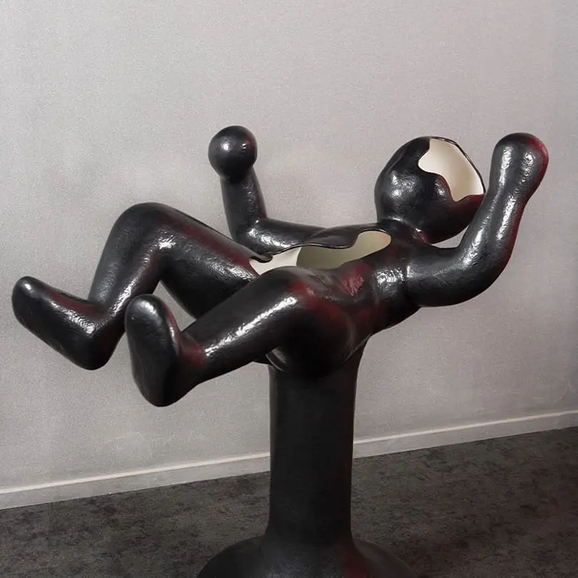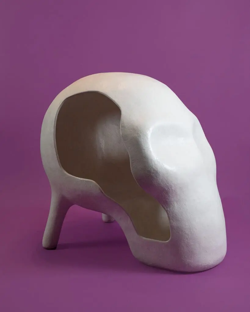 Skull Chair staat voor het einde van de levensloop, maar symboliseert ook het begin van alle ideeën: het intellect. Je kunt ermee zonder beperkingen in iemands hoofd kruipen.